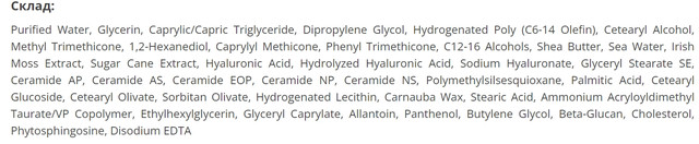 - Містить гіалуронову кислоту, пантенол, алантоїн та п’ятирівневі кераміди