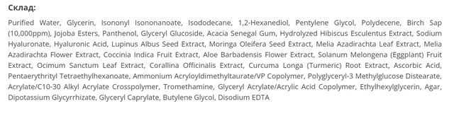 - Рослинні екстракти (бамія, білий люпин, кораліна, моринга, кокцинія, індійська шовковиця, алое, куркума, базилік) — мають заспокійливий і відновлюючий ефект.