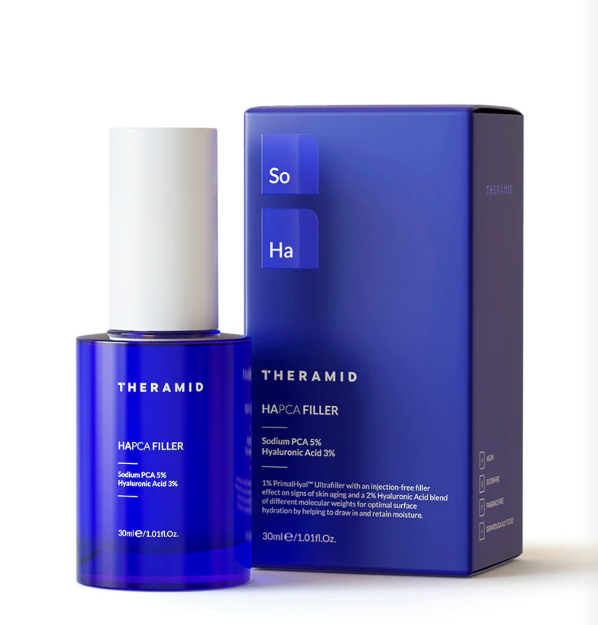 Theramid Hapca Filler — ідеальне рішення для зневодненої та вікової шкіри, що потребує глибокого зволоження і помітного розгладження зморшок. Завдяки компоненту Primahyal Ultrafiller™ (1%), який за своїми властивостями порівнюють з філерами, засіб швидко проникає вглиб епідермісу, миттєво заповнюючи зморшки зсередини та підвищуючи пружність шкіри.