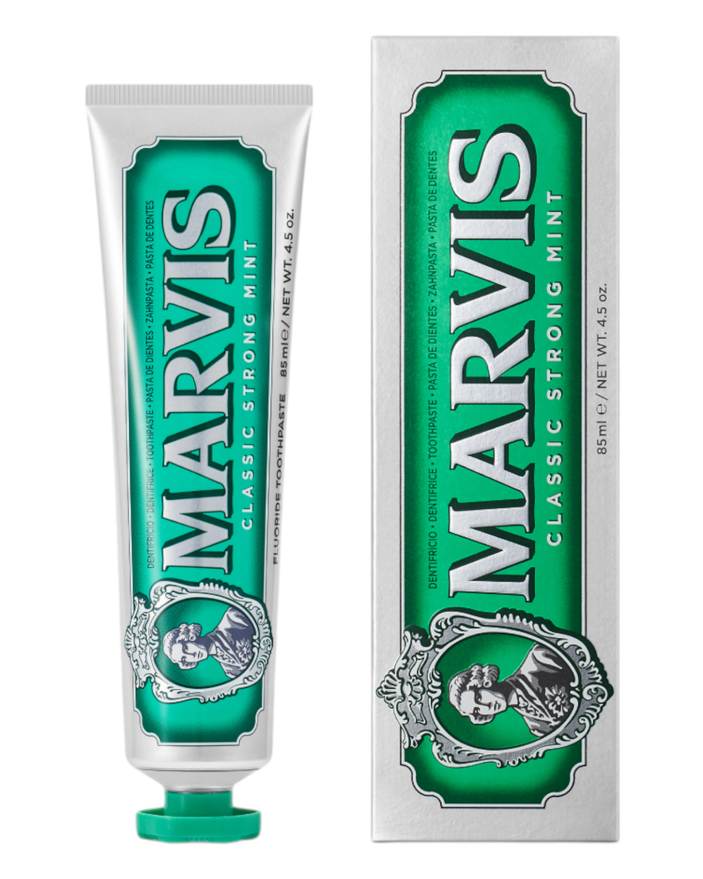 Зубна паста Marvis Classic Strong Mint виготовлена із суміші чистячих порошків, які не пошкоджують емаль і дентин. Містить фторид і ксиліт, які забезпечують профілактику карієсу та контроль бактеріальної флори ротової порожнини.
